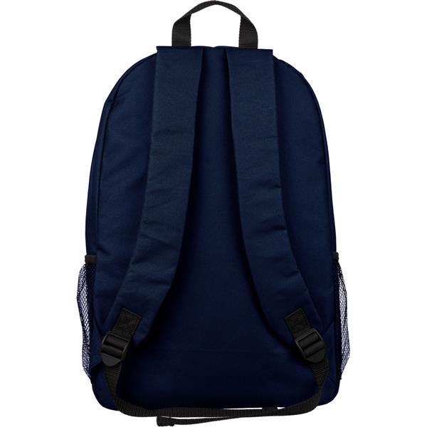 Plecak podróżny, siatkowate kieszenie po obu stronach, elastyczne sznurki z przodu do przymocowania butelki albo koca, zaciskane zamknięcie, mała kieszeń zapinana na zamek z przodu, kieszeń główna zapinana na zamek, ikona RPET na metce, produkt wykonany z RPET, poliestru i elastanu