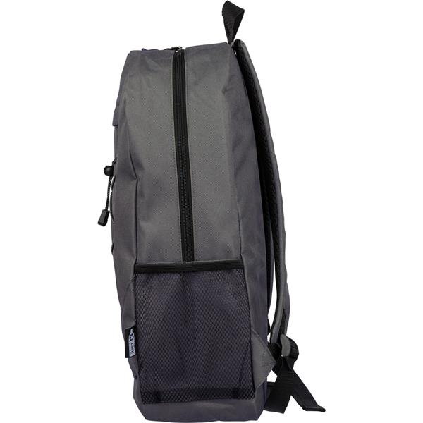Plecak podróżny, siatkowate kieszenie po obu stronach, elastyczne sznurki z przodu do przymocowania butelki albo koca, zaciskane zamknięcie, mała kieszeń zapinana na zamek z przodu, kieszeń główna zapinana na zamek, ikona RPET na metce, produkt wykonany z RPET, poliestru i elastanu