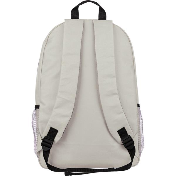 Plecak podróżny, siatkowate kieszenie po obu stronach, elastyczne sznurki z przodu do przymocowania butelki albo koca, zaciskane zamknięcie, mała kieszeń zapinana na zamek z przodu, kieszeń główna zapinana na zamek, ikona RPET na metce, produkt wykonany z RPET, poliestru i elastanu