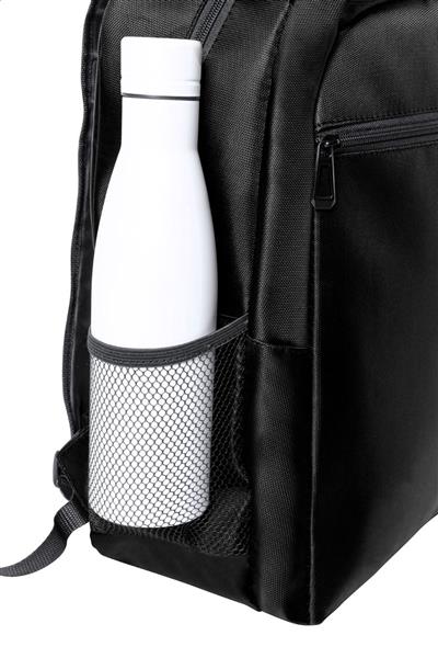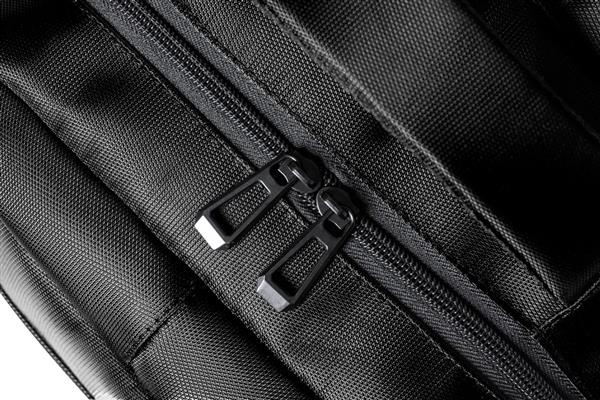 Plecak RNYLON z przegrodami zapinanymi na zamek, bocznymi kieszeniami z siatki, wyściełaną kieszenią na laptopa (15″), paskiem do walizki, wyściełanymi plecami i szelkami. Nylon 420D z recyklingu z charakterystyczną metką RNYLON.