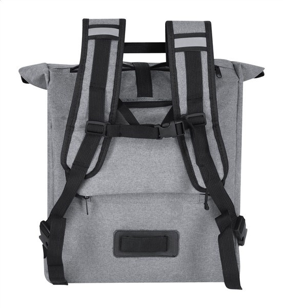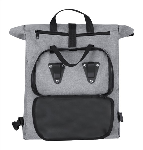 Plecak rowerowy z poliestru 600D RPET, z przednią kieszenią zapinaną na zamek i odpinanymi, wyściełanymi paskami na ramiona. Z ukrytymi zaciskami do montażu na ramie.