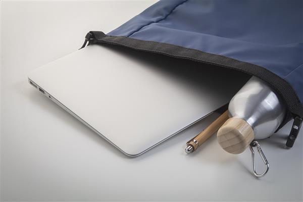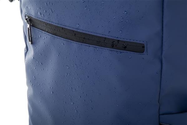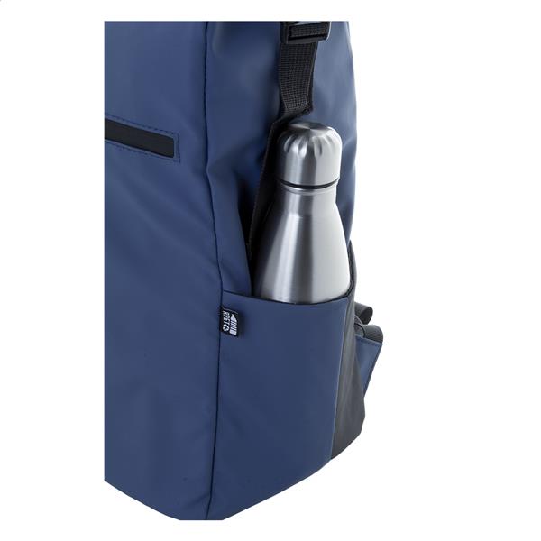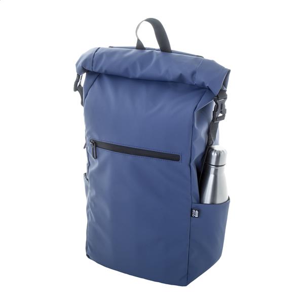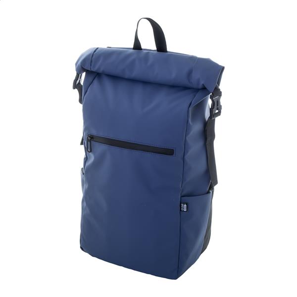 Wodoodporny plecak zwijany z RPET z klamrą i zapięciem na rzep, wyściełaną przegrodą na laptop (16″) i tablet (10″). Przednia kieszeń zapinana na zamek. Posiada kieszenie boczne, wyściełane plecy i paski na ramiona. Poliester 600D RPET powlekany PU, z charakterystyczną metką RPET.