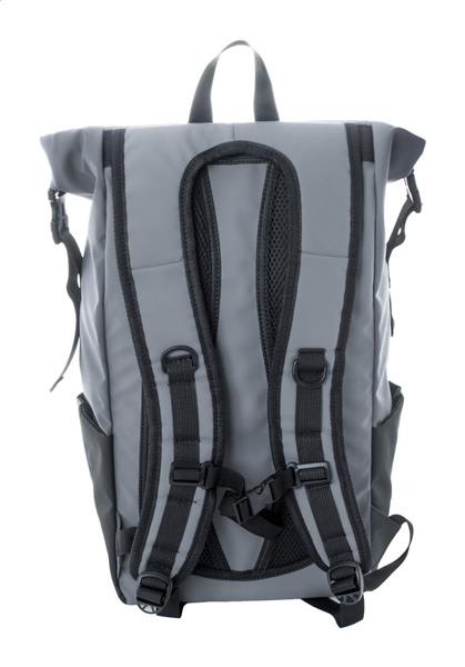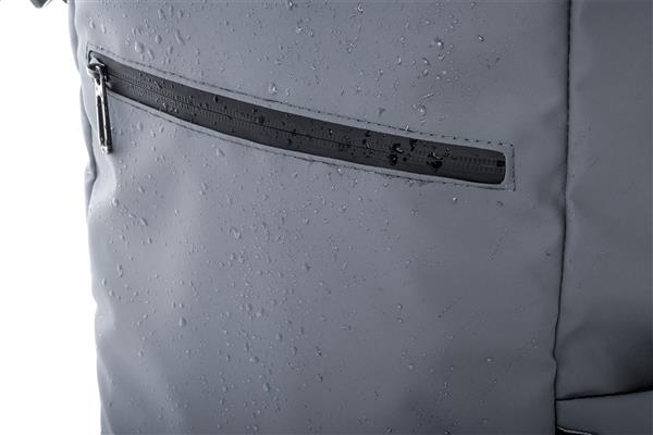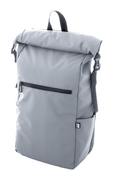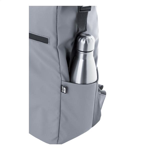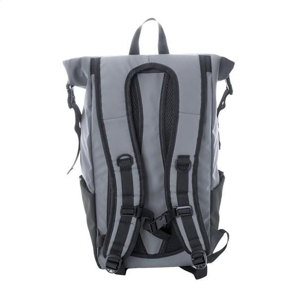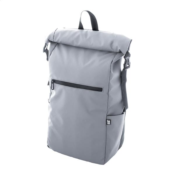 Wodoodporny plecak zwijany z RPET z klamrą i zapięciem na rzep, wyściełaną przegrodą na laptop (16″) i tablet (10″). Przednia kieszeń zapinana na zamek. Posiada kieszenie boczne, wyściełane plecy i paski na ramiona. Poliester 600D RPET powlekany PU, z charakterystyczną metką RPET.