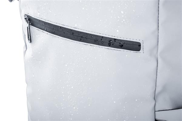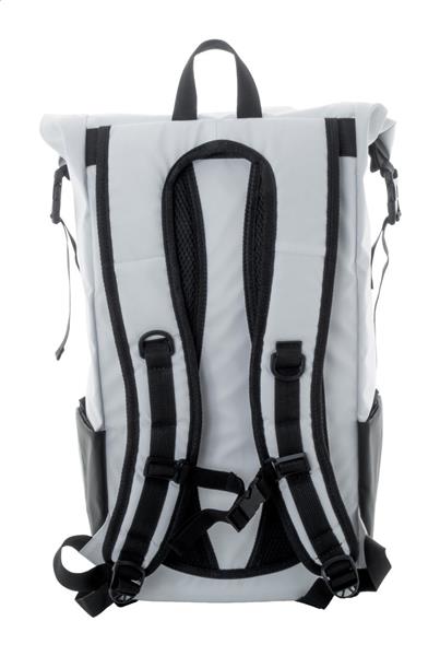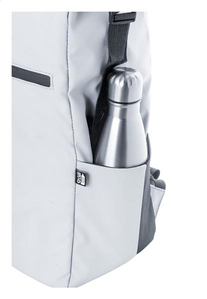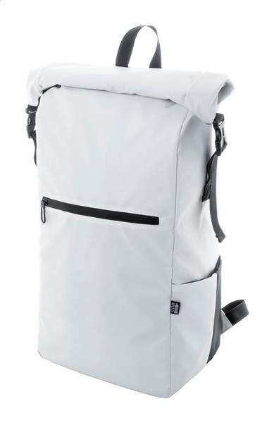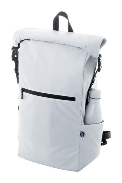 Wodoodporny plecak zwijany z RPET z klamrą i zapięciem na rzep, wyściełaną przegrodą na laptop (16″) i tablet (10″). Przednia kieszeń zapinana na zamek. Posiada kieszenie boczne, wyściełane plecy i paski na ramiona. Poliester 600D RPET powlekany PU, z charakterystyczną metką RPET.