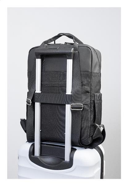 Plecak RPET z miękką, skórzaną górą z PU, komorą zapinaną na zamek, kieszenią przednią zapinaną na zamek, kieszeniami bocznymi i kieszenią antykradzieżową. Z paskiem do noszenia na walizce, wyściełanym tyłem i przegrodą na laptopa (15″). Poliester RPET 900D, z charakterystyczną metką RPET. W komplecie woreczek RPET zabezpieczający przed zabrudzeniem.