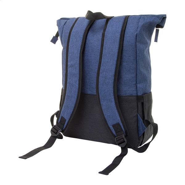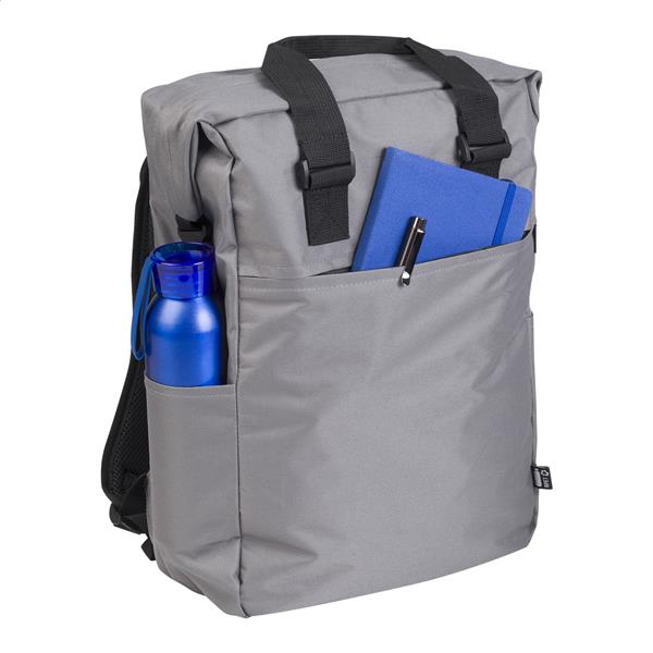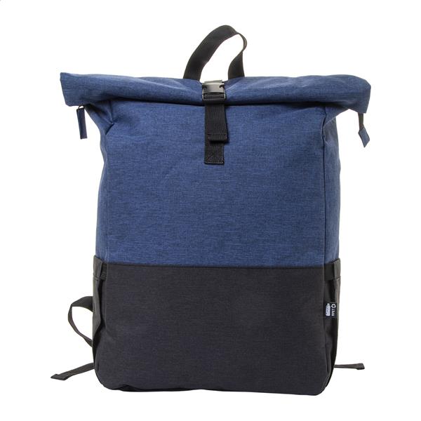 Dwukolorowy, zwijany plecak RPET z zapięciem na sprzączkę, główną komorą zapinaną na zamek, wyściełaną przegrodą na laptopa (15″) i tabletem (10″), kieszeniami bocznymi, wyściełanymi plecami i szelkami. Poliester 300D RPET z charakterystyczną metką RPET.