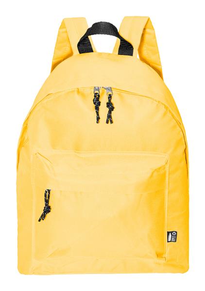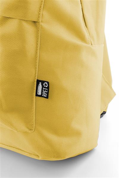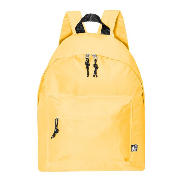 Plecak RPET z główną komorą zapinaną na zamek, przednią kieszenią zapinaną na zamek, wyściełanymi plecami i paskami na ramiona. Poliester RPET 600D, z charakterystyczną metką RPET.