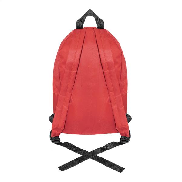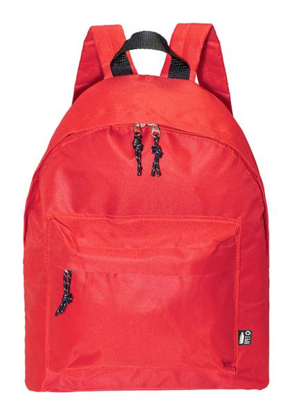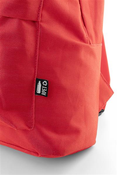 Plecak RPET z główną komorą zapinaną na zamek, przednią kieszenią zapinaną na zamek, wyściełanymi plecami i paskami na ramiona. Poliester RPET 600D, z charakterystyczną metką RPET.