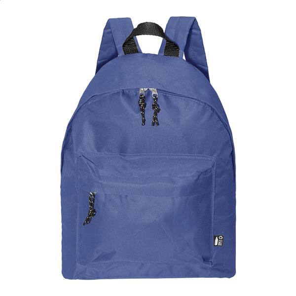 Plecak RPET z główną komorą zapinaną na zamek, przednią kieszenią zapinaną na zamek, wyściełanymi plecami i paskami na ramiona. Poliester RPET 600D, z charakterystyczną metką RPET.