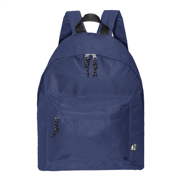 Plecak RPET z główną komorą zapinaną na zamek, przednią kieszenią zapinaną na zamek, wyściełanymi plecami i paskami na ramiona. Poliester RPET 600D, z charakterystyczną metką RPET.