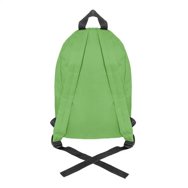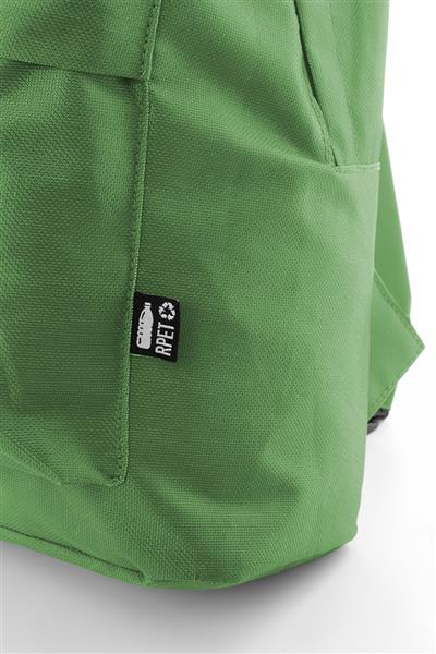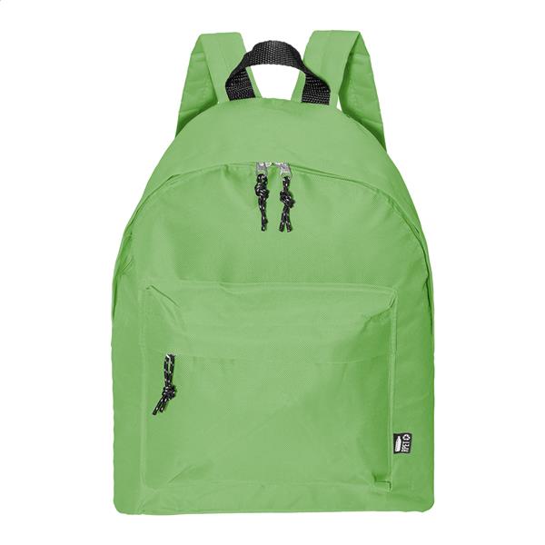 Plecak RPET z główną komorą zapinaną na zamek, przednią kieszenią zapinaną na zamek, wyściełanymi plecami i paskami na ramiona. Poliester RPET 600D, z charakterystyczną metką RPET.