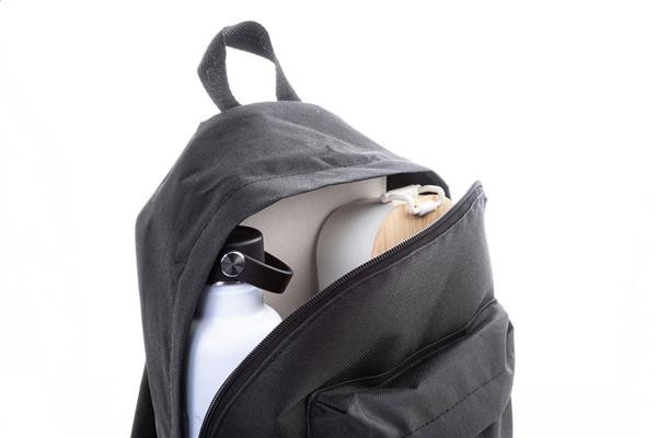 Plecak RPET z główną komorą zapinaną na zamek, przednią kieszenią zapinaną na zamek, wyściełanymi plecami i paskami na ramiona. Poliester RPET 600D, z charakterystyczną metką RPET.