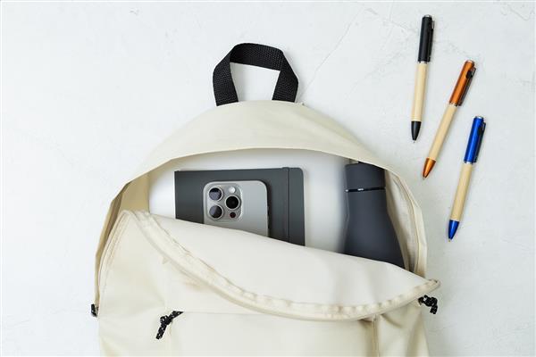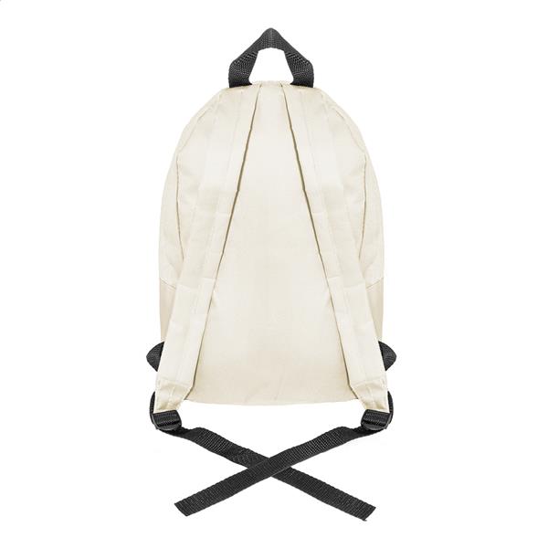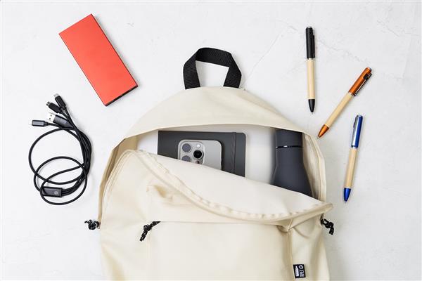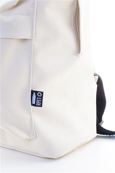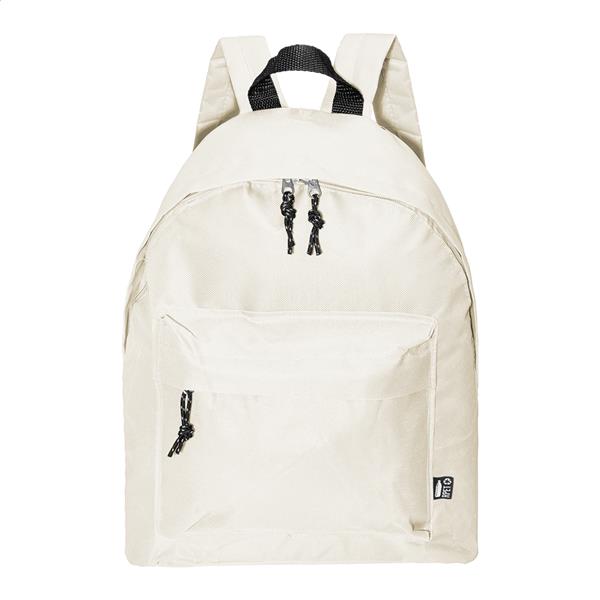 Plecak RPET z główną komorą zapinaną na zamek, przednią kieszenią zapinaną na zamek, wyściełanymi plecami i paskami na ramiona. Poliester RPET 600D, z charakterystyczną metką RPET.