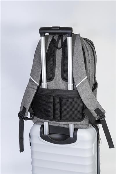 Plecak RPET z przegrodami zapinanymi na zamek, 2 kieszeniami z przodu zapinanymi na zamek, kieszeniami bocznymi zapinanymi na zamek oraz wyściełaną przegrodą na laptopa (15″). Z wyściełanymi plecami i paskami na ramię, kieszenią antykradzieżową i paskiem do noszenia na walizce. Wykonany z poliestru RPET 300D, z charakterystyczną metką RPET.