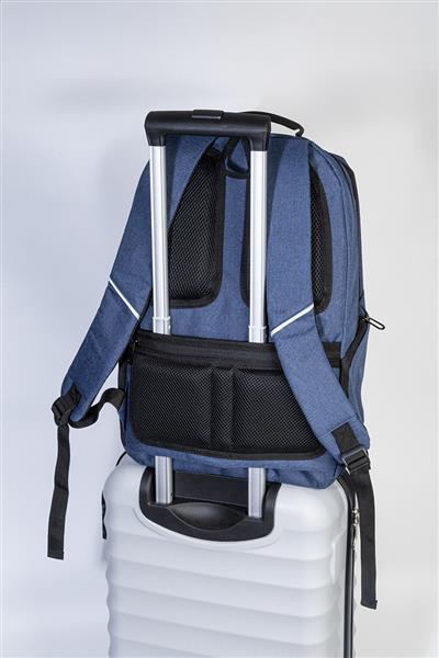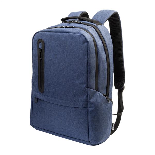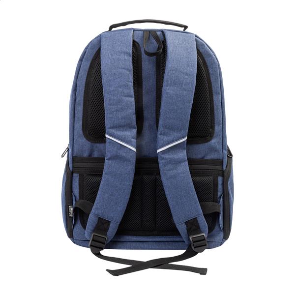 Plecak RPET z przegrodami zapinanymi na zamek, 2 kieszeniami z przodu zapinanymi na zamek, kieszeniami bocznymi zapinanymi na zamek oraz wyściełaną przegrodą na laptopa (15″). Z wyściełanymi plecami i paskami na ramię, kieszenią antykradzieżową i paskiem do noszenia na walizce. Wykonany z poliestru RPET 300D, z charakterystyczną metką RPET.