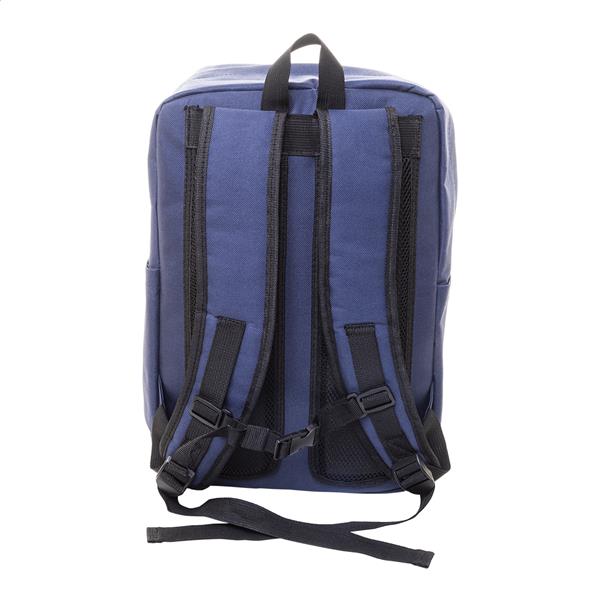 Plecak RPET z główną komorą na suwak, 2 kieszeniami z przodu na suwak, kieszeniami bocznymi i wyściełaną przegrodą na laptopa (15″) i tablet (10″). Z wyściełanym tyłem i paskami na ramiona. Poliester RPET 600D, z charakterystyczną metką RPET.