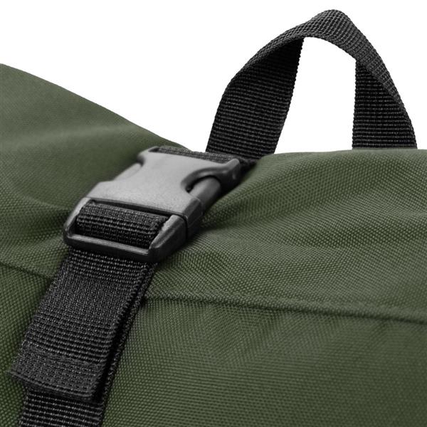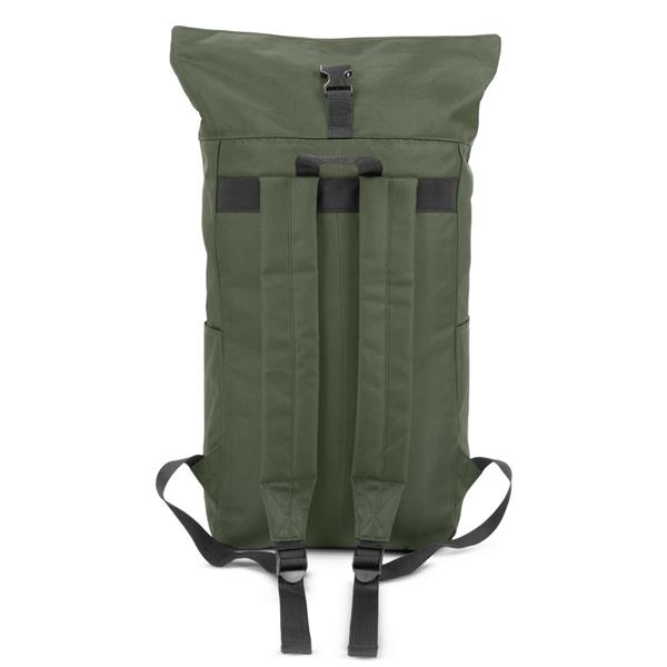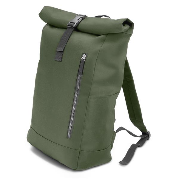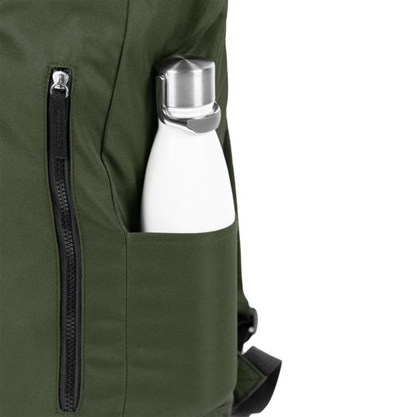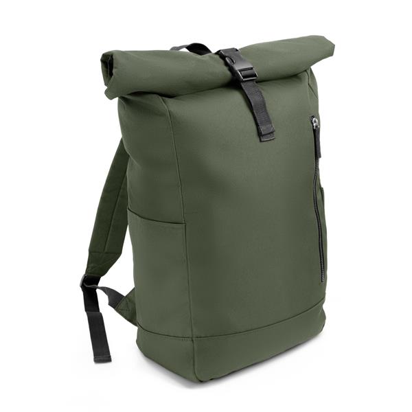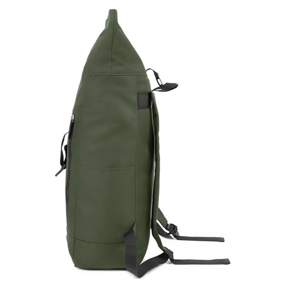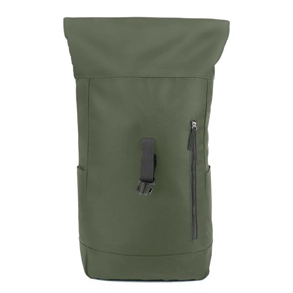 Plecak z przednią kieszenią i główną przegrodą na zamek błyskawiczny, wykonany z RPET, zgodny z certyfikatem GRS (Global RecycIed Standard), 2 kieszenie boczne, rozwijalna główna kieszeń zamykana na klamrę, która umożliwia zwiększanie pojemności plecaka oraz lepiej chroni przed czynnikami atmosferycznymi po zwinięciu, regulowane paski na ramię