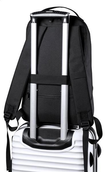 Wodoodporny plecak RPET z przegrodami zapinanymi na zamek, wyściełaną przegrodą na laptopa (15″) i tablet (10″), paskiem do walizki, ukrytą kieszenią antykradzieżową i ergonomicznymi paskami na ramiona. Poliester 600D RPET z charakterystyczną metką RPET.