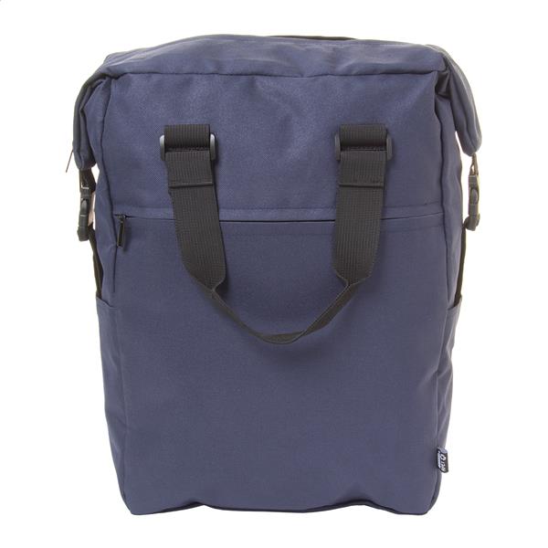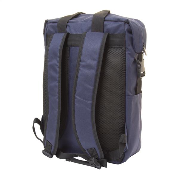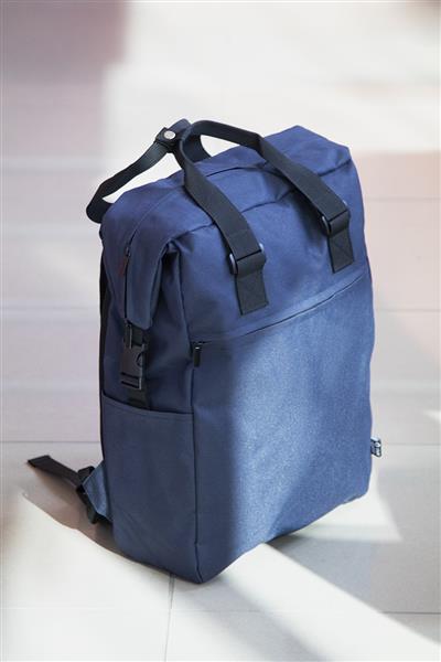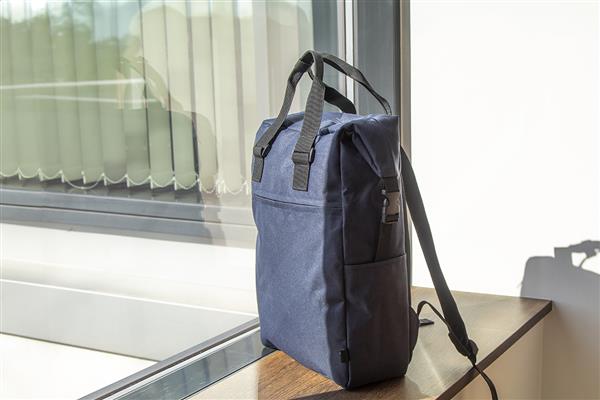 Plecak RPET z zapinaną na zamek komorą główną i kieszenią przednią, wyściełaną przegrodą na laptopa (15″) i tabletem (10″), bocznymi paskami z klamrami i kieszeniami, wyściełanymi plecami i szelkami. Poliester 600D RPET z charakterystyczną metką RPET.
