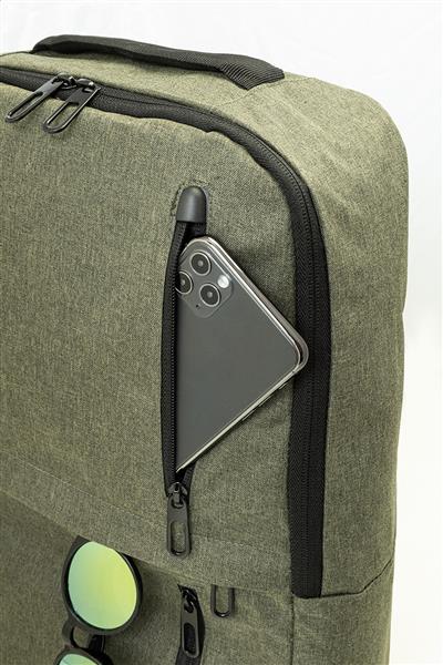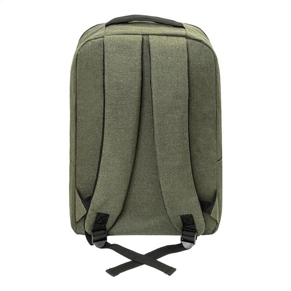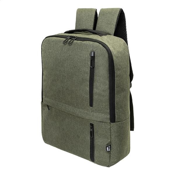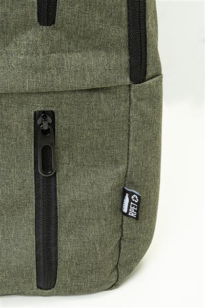 Plecak RPET z główną komorą zapinaną na zamek i trzema przednimi kieszeniami zapinanymi na zamek. Z wyściełanymi przegrodami na tablet (10″) i laptopa (15″), wyściełanymi plecami i paskami na ramię. Poliester RPET 600D, z charakterystyczną metką RPET.
