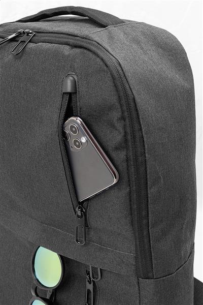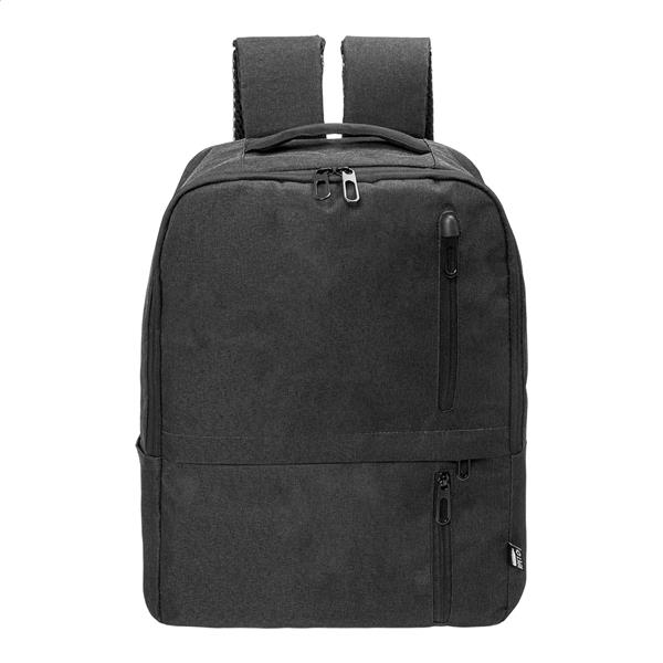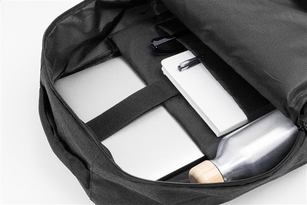Plecak RPET z główną komorą zapinaną na zamek i trzema przednimi kieszeniami zapinanymi na zamek. Z wyściełanymi przegrodami na tablet (10″) i laptopa (15″), wyściełanymi plecami i paskami na ramię. Poliester RPET 600D, z charakterystyczną metką RPET.