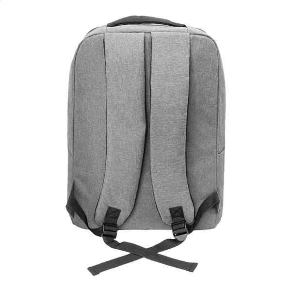 Plecak RPET z główną komorą zapinaną na zamek i trzema przednimi kieszeniami zapinanymi na zamek. Z wyściełanymi przegrodami na tablet (10″) i laptopa (15″), wyściełanymi plecami i paskami na ramię. Poliester RPET 600D, z charakterystyczną metką RPET.