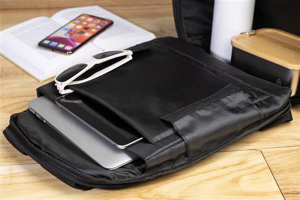Plecak antykradzieżowy RPET z przegrodą zapinaną na zamek, wyściełaną przegrodą na laptopa (15″) i tablet (12″), paskiem na walizkę, wyściełanymi plecami i paskami na ramię. Z ukrytą kieszenią antykradzieżową. Poliester RPET 300D. Z charakterystyczną metką RPET.