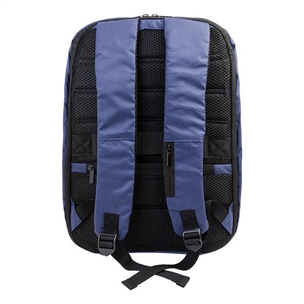 Plecak antykradzieżowy RPET z przegrodą zapinaną na zamek, wyściełaną przegrodą na laptopa (15″) i tablet (12″), paskiem na walizkę, wyściełanymi plecami i paskami na ramię. Z ukrytą kieszenią antykradzieżową. Poliester RPET 300D. Z charakterystyczną metką RPET.