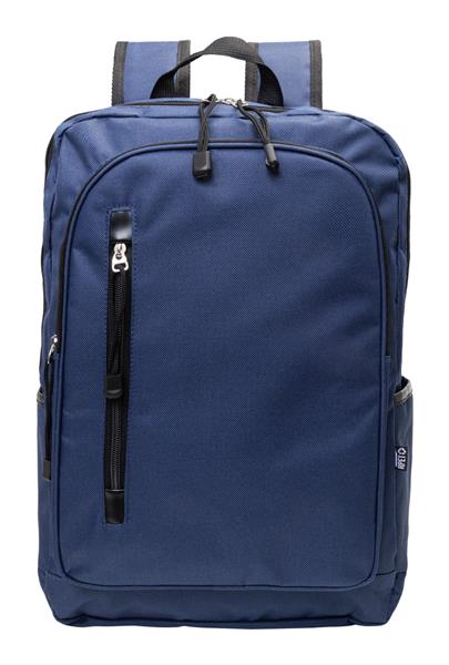 Plecak RPET z główną komorą na suwak, 2 kieszeniami z przodu na suwak, kieszeniami bocznymi i wyściełaną przegrodą na laptopa (15″). Z wyściełanym tyłem i paskami na ramiona. Poliester RPET 600D, z charakterystyczną metką RPET.
