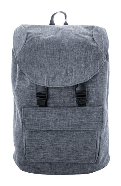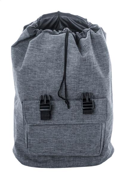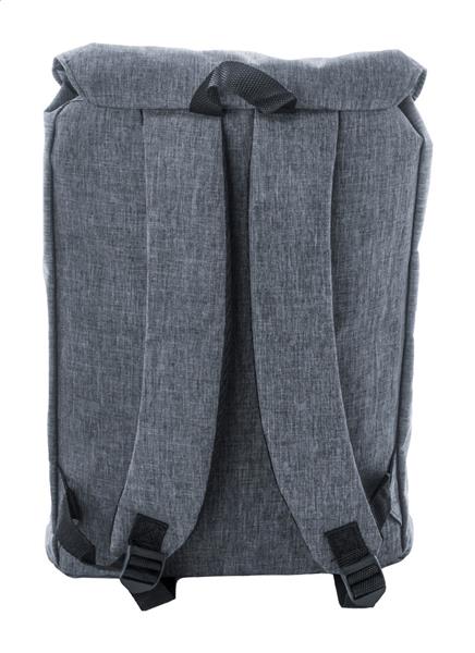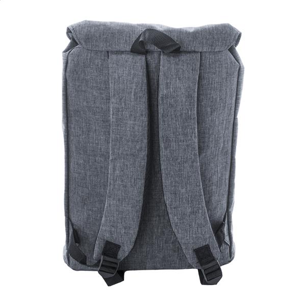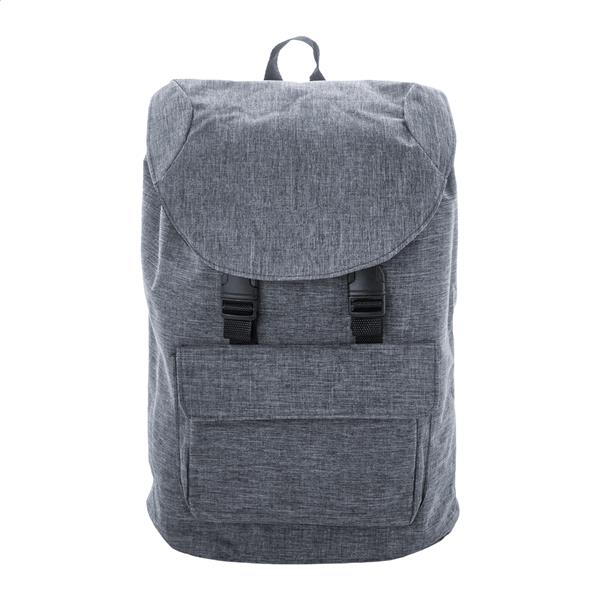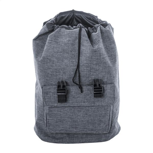 Plecak RPET zapinany na klamrę i sznurek, przednia kieszeń na rzep, przegroda na laptopa (15″), wyściełane plecy i paski na ramiona. Poliester 300D RPET z charakterystyczną metką RPET.