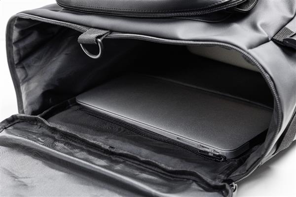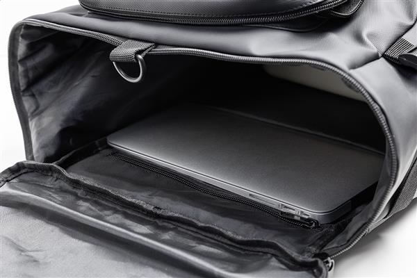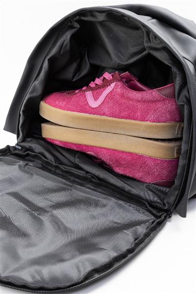 Wodoodporny plecak z materiału RPET z główną komorą zapinaną na zamek, 2 kieszeniami z przodu zapinanymi na zamek, kieszeniami bocznymi i przegrodą na buty zapinaną na zamek. Z wyściełaną przegrodą na laptopa (15″), wyściełanymi plecami i szelkami. Z bocznymi paskami z regulacją rozmiaru. Wykonany z poliestru RPET 600D powlekanego poliuretanem, z charakterystyczną metką RPET.