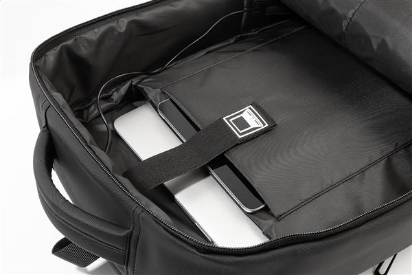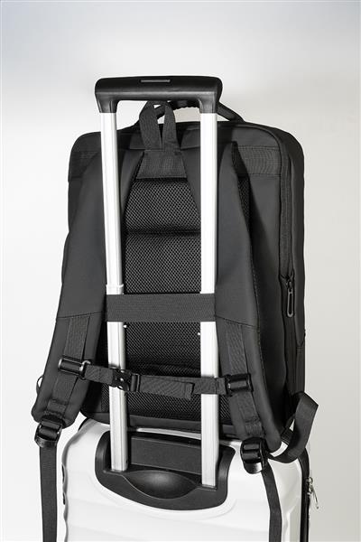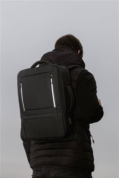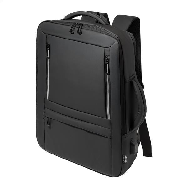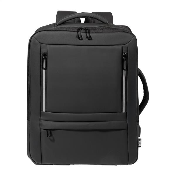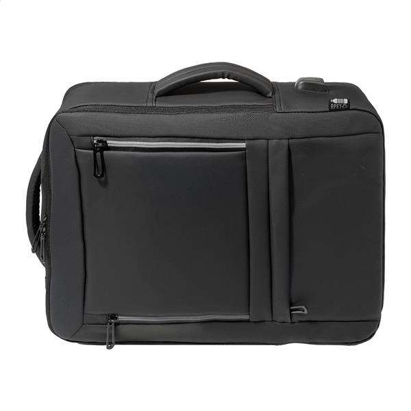 Wodoodporny, rozkładany plecak i torba na dokumenty z materiału RPET z główną komorą zapinaną na zamek, przednimi kieszeniami z odblaskowymi zamkami, wyściełaną przegrodą na laptopa (15″) i tablet (12″) oraz wbudowanym portem USB do powerbanków. Z paskiem do wózka, wyściełanym tyłem i szelkami oraz pasem piersiowym. Wykonany z poliestru RPET 600D powlekanego poliuretanem, z charakterystyczną metką RPET.