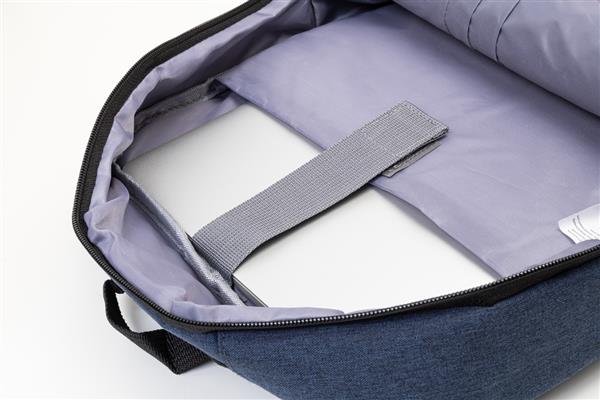 Plecak RPET z główną komorą na suwak, 2 kieszeniami na suwak, kieszenią boczną i wyściełaną przegrodą na laptopa (15″). Z paskiem na wózek, wyściełanym tyłem i paskami na ramiona. Poliester RPET 600D, z charakterystyczną metką RPET.