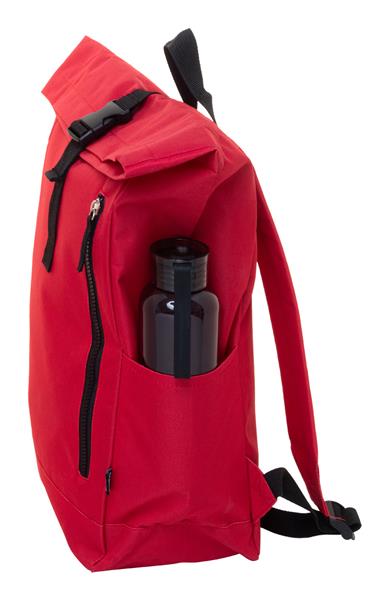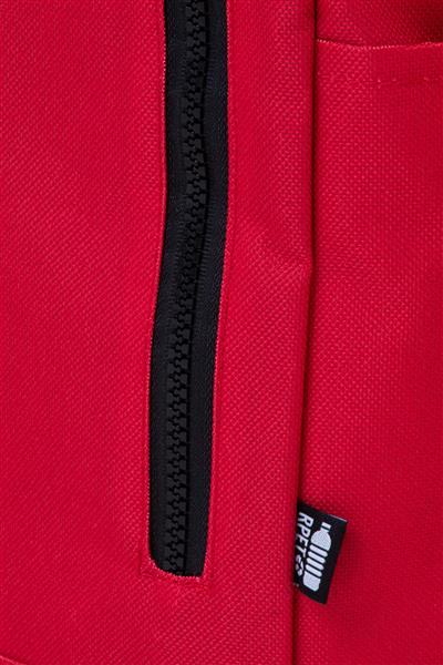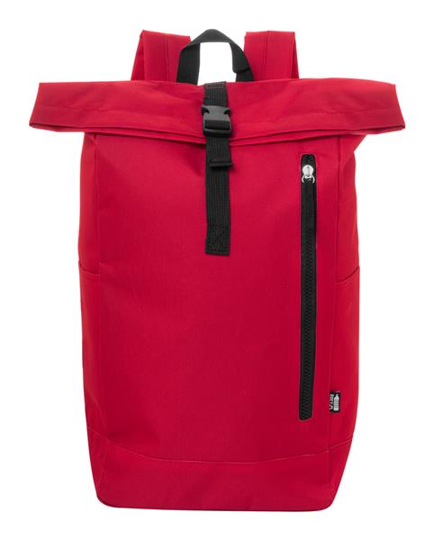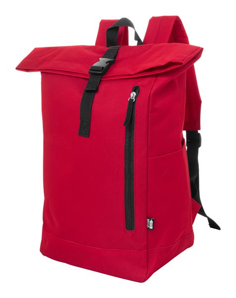 Plecak zwijany RPET z zapięciem na klamrę, przegrodą na laptopa (14″) i przednią kieszenią zapinaną na zamek. Z wyściełanymi plecami i paskami naramiennymi Poliester 600D RPET z charakterystyczną metką RPET.