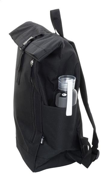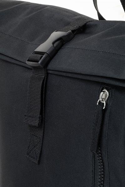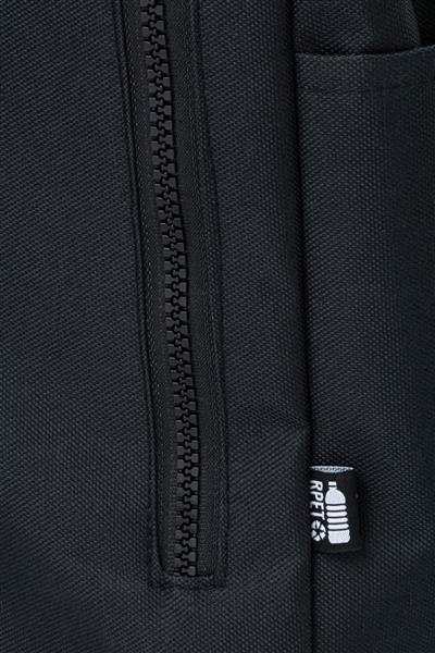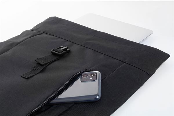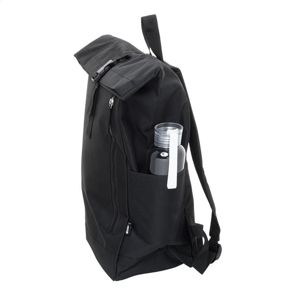 Plecak zwijany RPET z zapięciem na klamrę, przegrodą na laptopa (14″) i przednią kieszenią zapinaną na zamek. Z wyściełanymi plecami i paskami naramiennymi Poliester 600D RPET z charakterystyczną metką RPET.