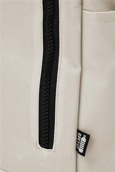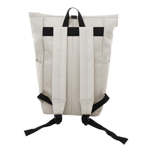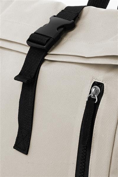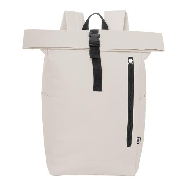 Plecak zwijany RPET z zapięciem na klamrę, przegrodą na laptopa (14″) i przednią kieszenią zapinaną na zamek. Z wyściełanymi plecami i paskami naramiennymi Poliester 600D RPET z charakterystyczną metką RPET.