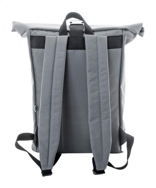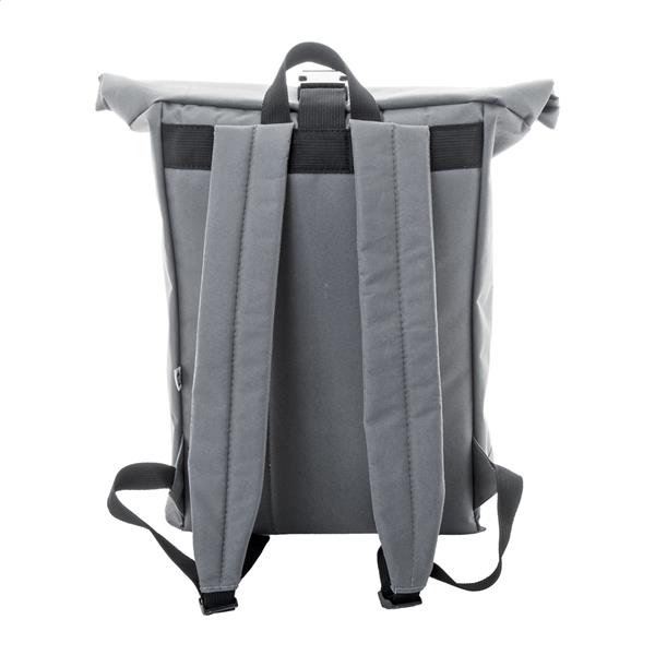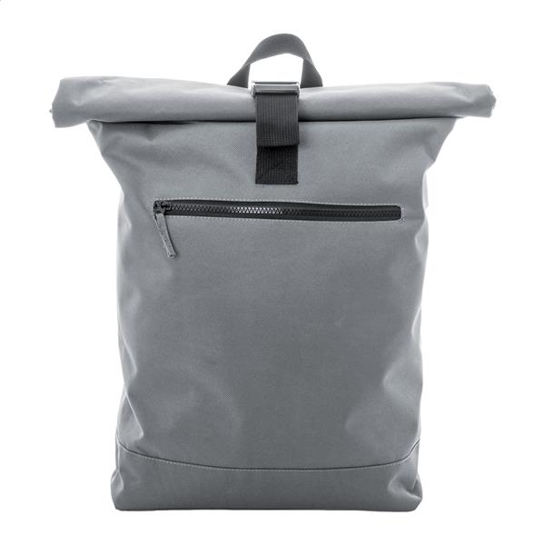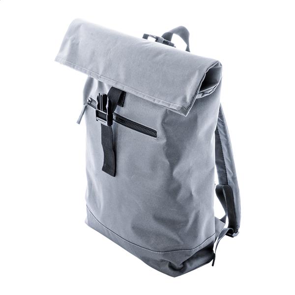 Plecak zwijany RPET zapinany na klamrę, przednia kieszeń zapinana na zamek, wyściełana przegroda na laptopa (15″), wyściełane plecy i paski na ramiona. Poliester 600D RPET z charakterystyczną metką RPET.