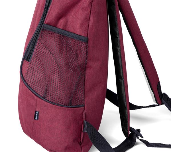 Plecak RPET z komorą zapinaną na zamek i przednią kieszenią, bocznymi kieszeniami z siateczki, wyściełanymi plecami i szelkami. Poliester 300D RPET z charakterystyczną metką RPET.