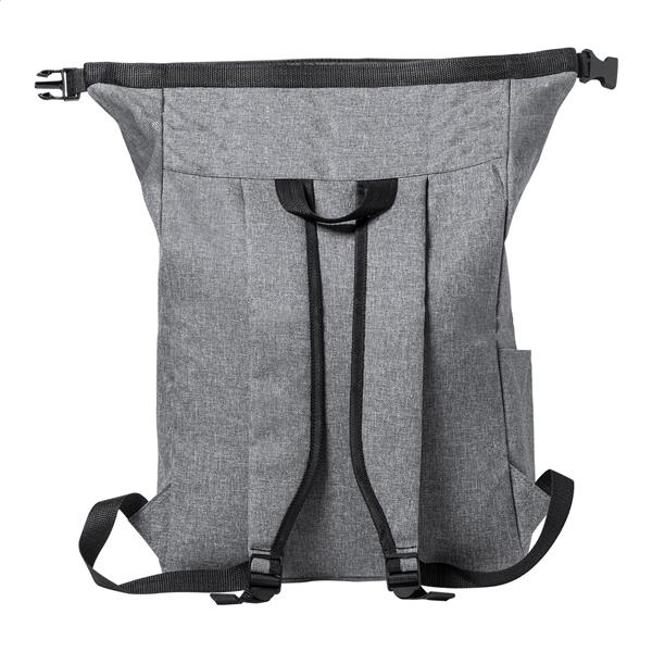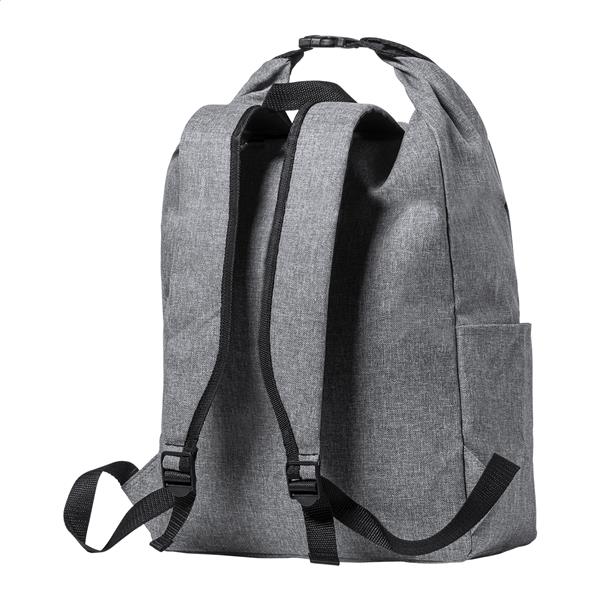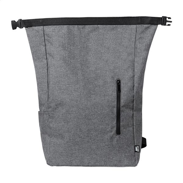 Wodoodporny, zwijany plecak z RPET z boczną kieszenią, przednią kieszenią zapinaną na zamek, wyściełanym tyłem i paskami na ramiona. Z charakterystyczną metką RPET. Poliester 300D RPET.