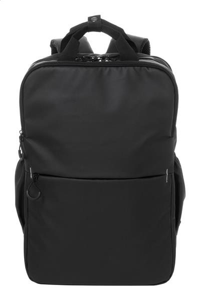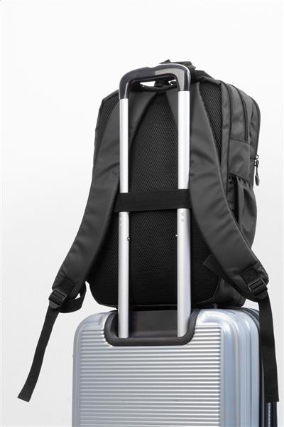 Wodoodporny plecak RPET z 2 przegrodami zapinanymi na zamek, 2 kieszeniami przednimi zapinanymi na zamek, kieszeniami bocznymi i wyściełaną przegrodą na laptopa (16″). Z paskiem do walizki, wyściełanymi plecami i paskami naramiennymi. Poliester 600D RPET pokryty PU, z charakterystyczną metką RPET.
