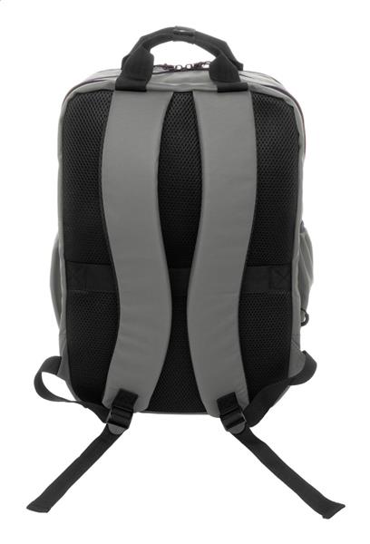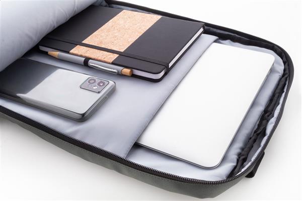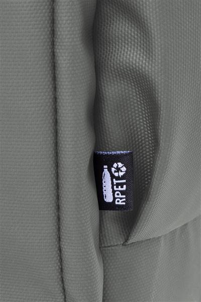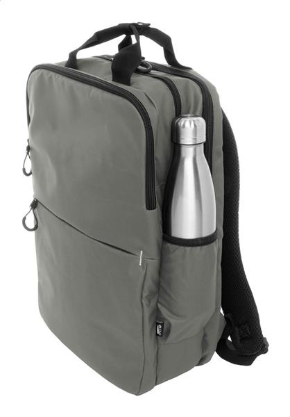 Wodoodporny plecak RPET z 2 przegrodami zapinanymi na zamek, 2 kieszeniami przednimi zapinanymi na zamek, kieszeniami bocznymi i wyściełaną przegrodą na laptopa (16″). Z paskiem do walizki, wyściełanymi plecami i paskami naramiennymi. Poliester 600D RPET pokryty PU, z charakterystyczną metką RPET.