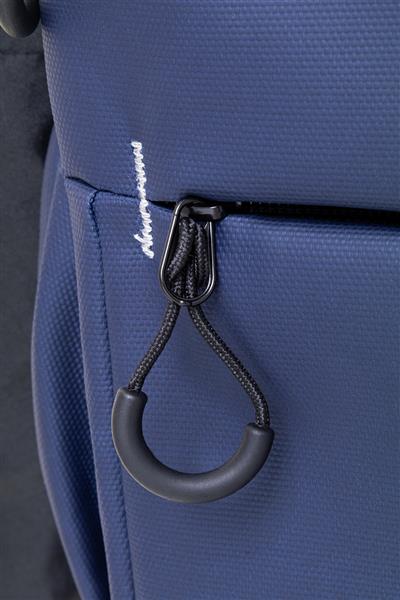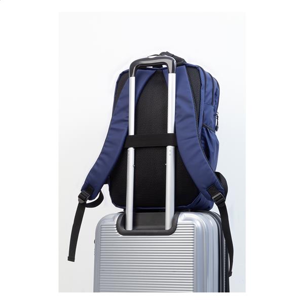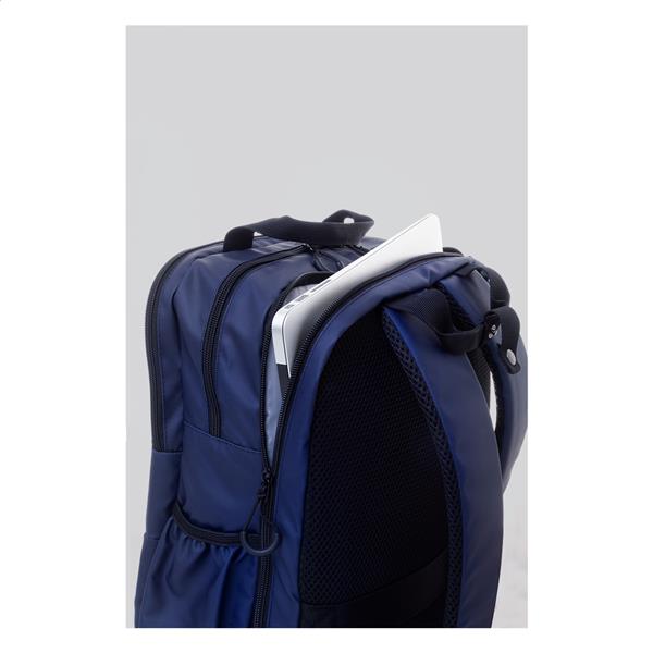 Wodoodporny plecak RPET z 2 przegrodami zapinanymi na zamek, 2 kieszeniami przednimi zapinanymi na zamek, kieszeniami bocznymi i wyściełaną przegrodą na laptopa (16″). Z paskiem do walizki, wyściełanymi plecami i paskami naramiennymi. Poliester 600D RPET pokryty PU, z charakterystyczną metką RPET.