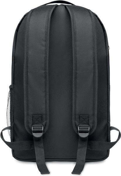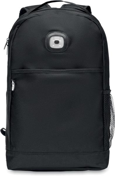 Plecak z 600D RPET. Przednia kieszeń zapinana na rzep. Lampka COB w kolorze białym z 3 różnymi ustawieniami jasności. Kieszeń z siatki z boku. W zestawie bateria.