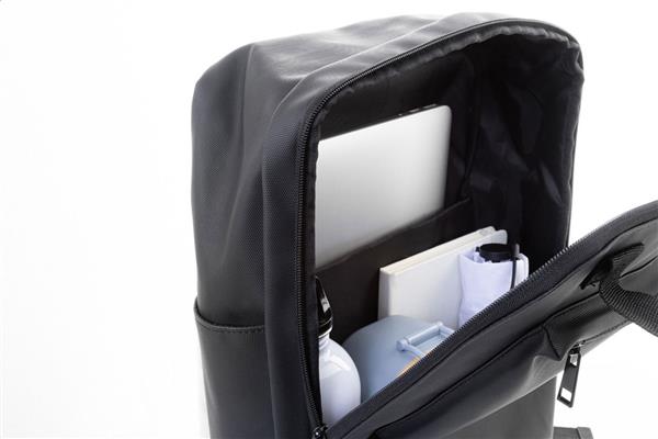 Wodoodporny, miękki plecak z recyklingowanej skóry PU z główną komorą na suwak, 2 kieszeniami z przodu na suwak, kieszeniami bocznymi i wyściełaną przegrodą na laptopa (15″) i tablet (10″). Z wyściełanym tyłem i paskami na ramiona. Z charakterystyczną metką z recyklingowanego PU.