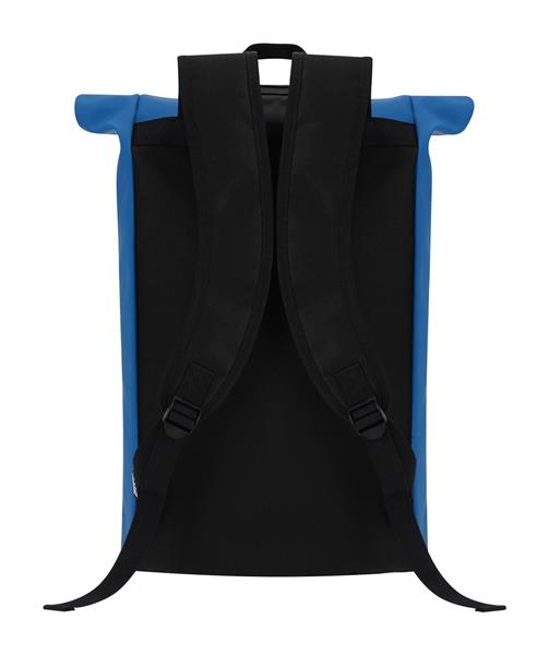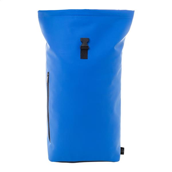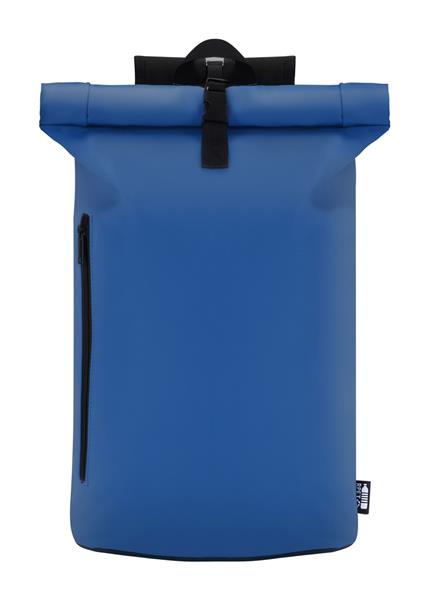 Wodoodporny, miękki plecak z recyklingowanej skóry PU z zamknięciem na klamrę, kieszenią z przodu zapinaną na zamek i wyściełaną przegrodą na laptopa (15″). Z wyściełanym tyłem i paskami na ramiona. Z charakterystyczną metką z recyklingowanego PU.