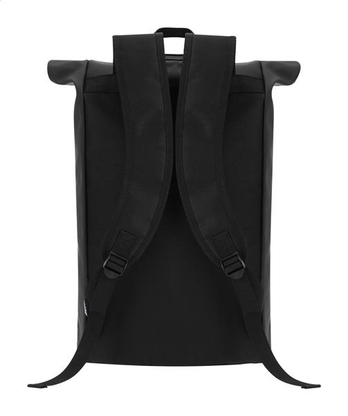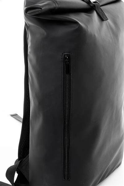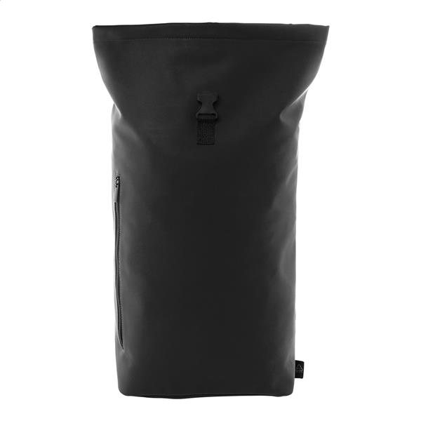 Wodoodporny, miękki plecak z recyklingowanej skóry PU z zamknięciem na klamrę, kieszenią z przodu zapinaną na zamek i wyściełaną przegrodą na laptopa (15″). Z wyściełanym tyłem i paskami na ramiona. Z charakterystyczną metką z recyklingowanego PU.