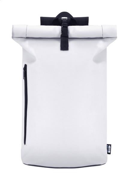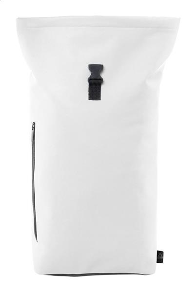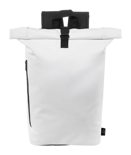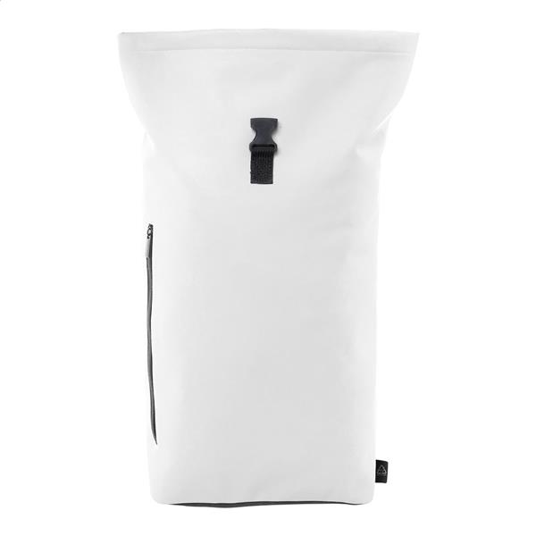 Wodoodporny, miękki plecak z recyklingowanej skóry PU z zamknięciem na klamrę, kieszenią z przodu zapinaną na zamek i wyściełaną przegrodą na laptopa (15″). Z wyściełanym tyłem i paskami na ramiona. Z charakterystyczną metką z recyklingowanego PU.