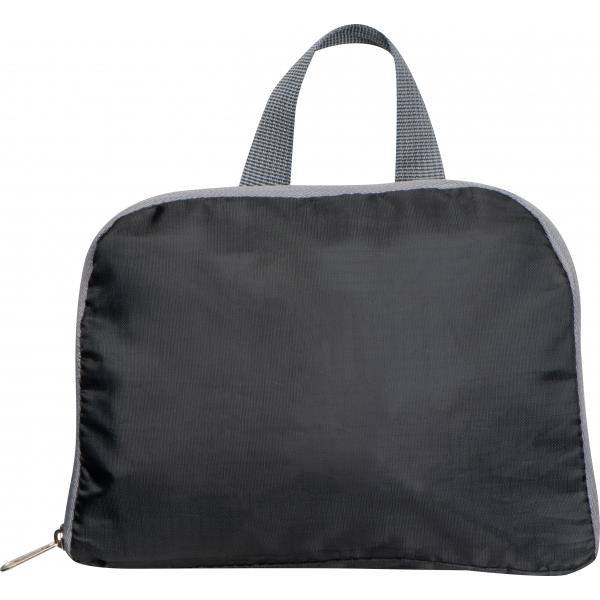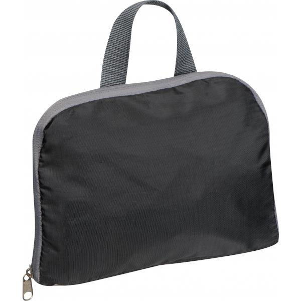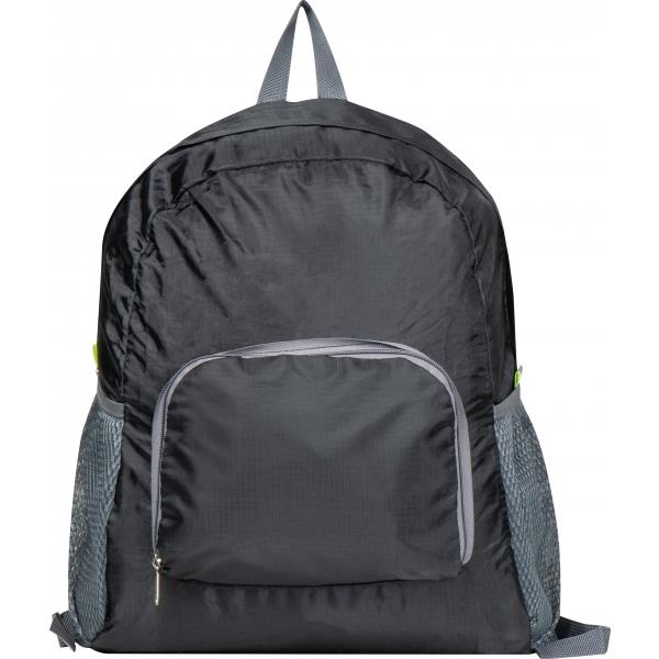 Składany plecak z RPET. Plecak posiada komorę główną zamykaną na zamek i dwie boczne siateczkowe kieszonki.