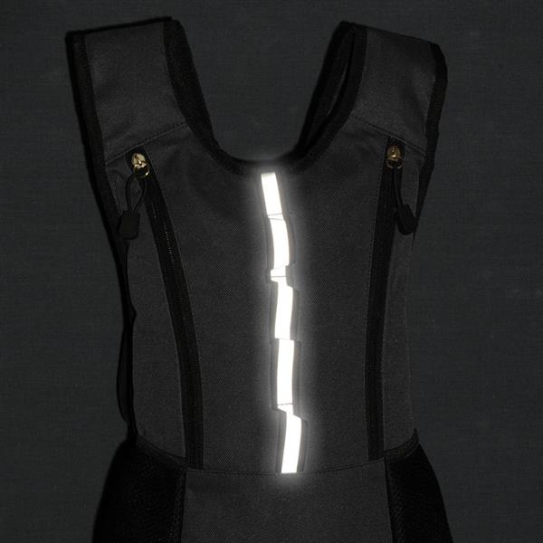 Wykonany z poliestru 600 D plecak sportowy z bocznymi kieszonkami. Wyposażony w regulowane szelki i odblaskową naszywkę. Pojemność 14 litrów.