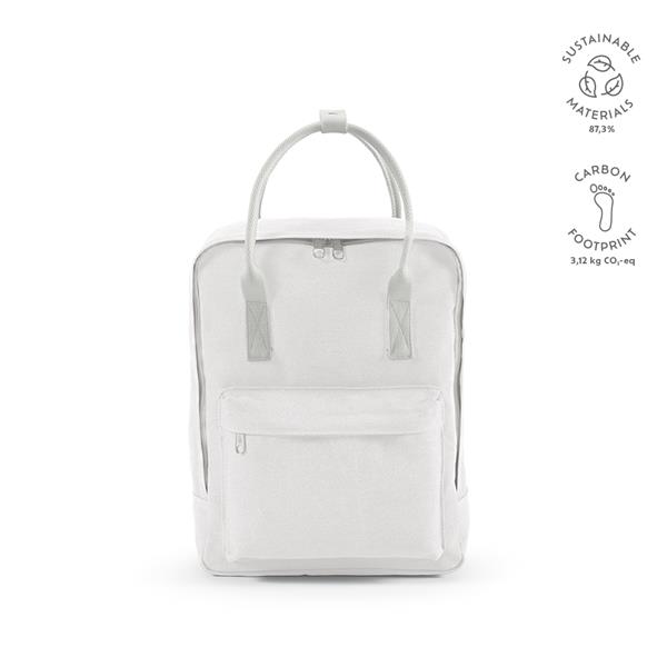 Wykonany z bawełnianego płótna z recyklingu (450 g/m2), ten plecak o pojemności 18 litrów jest przykładem zrównoważonego rozwoju. Posiada dwa uchwyty umieszczone dla większej wygody i paski na ramię z rPET. Posiada również przednią kieszeń. Zapakowany w torbę PE z recyklingu.